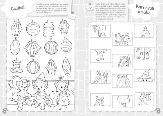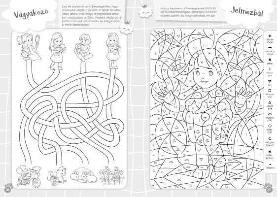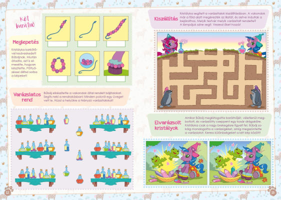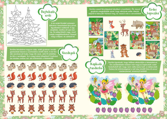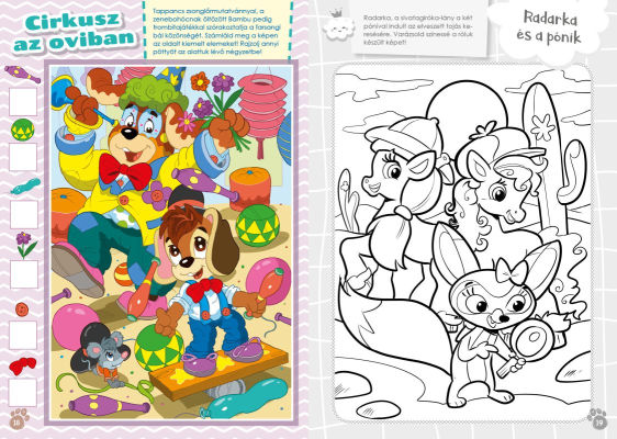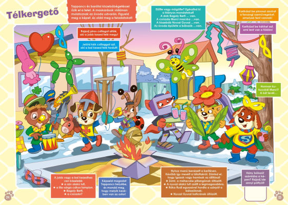 A színes oldalak minden hónapban tartalmaznak téri tájékozódást, alapvető matematikai készségeket, szín- és formaismeretet, logikus gondolkodást, koncentrációt és finommotorikát fejlesztő feladatokat, szórakoztató rejtvényeket és fejtörőket, rajzpályázatot, valamint hasznos nevelési tanácsokat a gyermekpszichológustól.