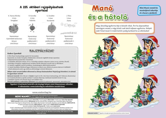A Mini Manó képességfejlesztő magazin elsősorban középső csoportos óvodásoknak készül. Életkori sajátosságaiknak megfelelő szintű készség-és képességfejlesztő, az évszakhoz igazodó tartalommal. A környezet megismerésével kapcsolatos, matematikai és logikai feladatok, a kézügyességet, a finommotorikát fejlesztő barkács-, valamint vonalvezető, pontösszekötő oldalak és színezők egyaránt megtalálhatóak az újságban.
