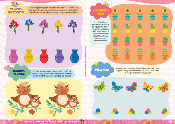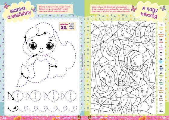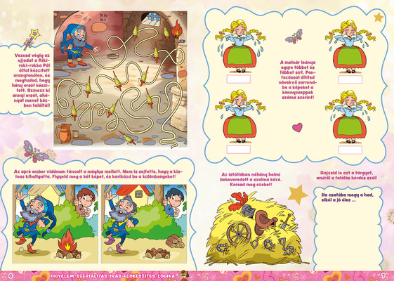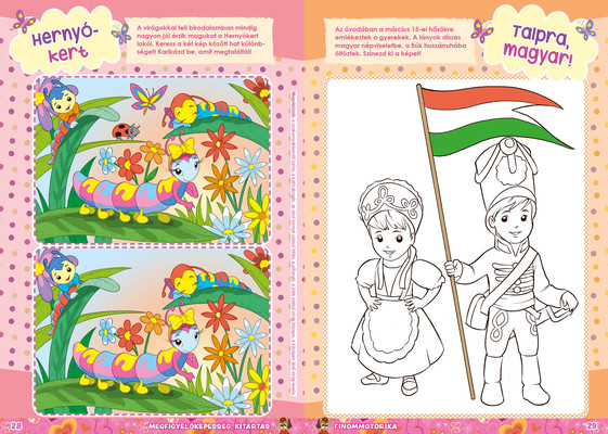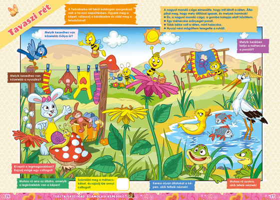 A színes oldalak minden hónapban tartalmaznak téri tájékozódást, alapvető matematikai készségeket, szín- és formaismeretet, logikus gondolkodást, koncentrációt és finommotorikát fejlesztő feladatokat, szórakoztató rejtvényeket és fejtörőket, rajzpályázatot, valamint hasznos nevelési tanácsokat a gyermekpszichológustól.