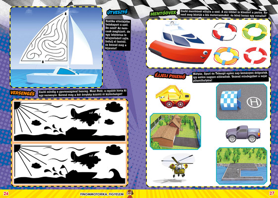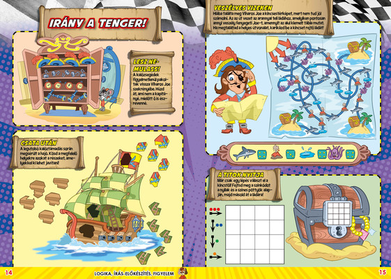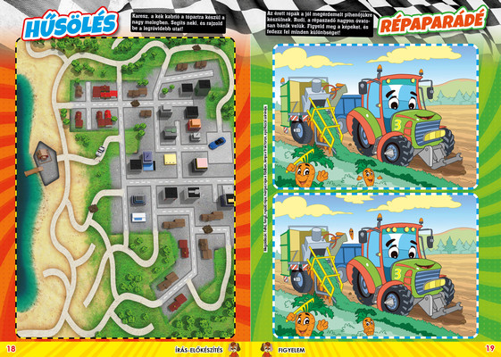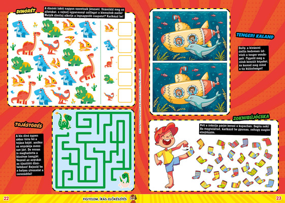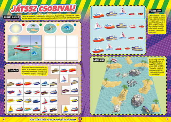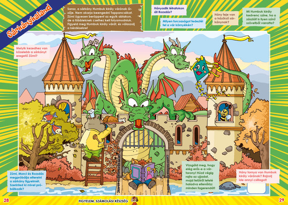 A színes oldalak minden hónapban tartalmaznak téri tájékozódást, alapvető matematikai készségeket, szín- és formaismeretet, logikus gondolkodást, koncentrációt és finommotorikát fejlesztő feladatokat, szórakoztató rejtvényeket és fejtörőket, rajzpályázatot, valamint hasznos nevelési tanácsokat a gyermekpszichológustól.