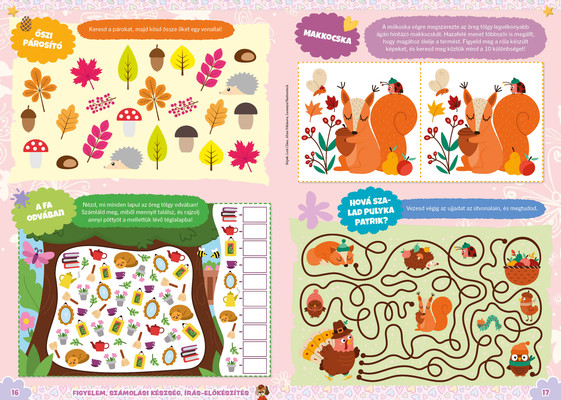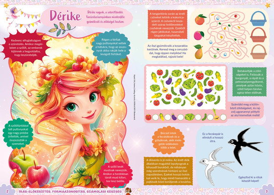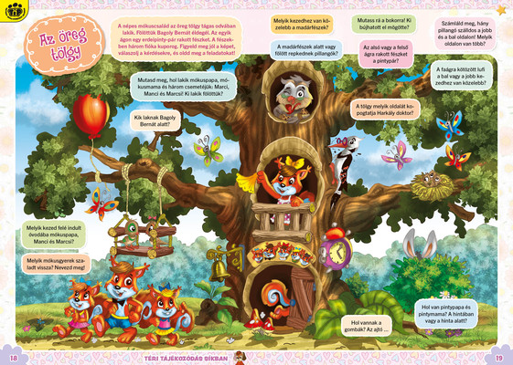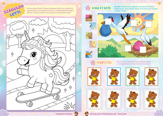A színes oldalak minden hónapban tartalmaznak téri tájékozódást, alapvető matematikai készségeket, szín- és formaismeretet, logikus gondolkodást, koncentrációt és finommotorikát fejlesztő feladatokat, szórakoztató rejtvényeket és fejtörőket, rajzpályázatot, valamint hasznos nevelési tanácsokat a gyermekpszichológustól.