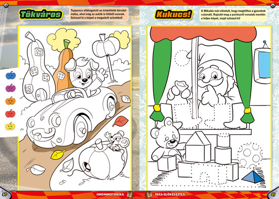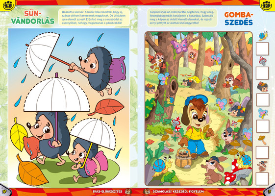 A színes oldalak minden hónapban tartalmaznak téri tájékozódást, alapvető matematikai készségeket, szín- és formaismeretet, logikus gondolkodást, koncentrációt és finommotorikát fejlesztő feladatokat, szórakoztató rejtvényeket és fejtörőket, rajzpályázatot, valamint hasznos nevelési tanácsokat a gyermekpszichológustól.