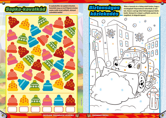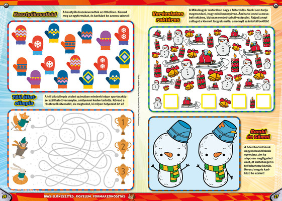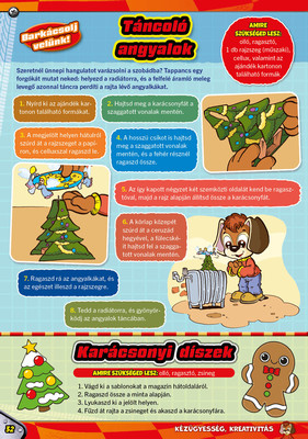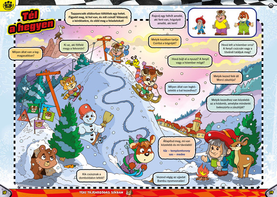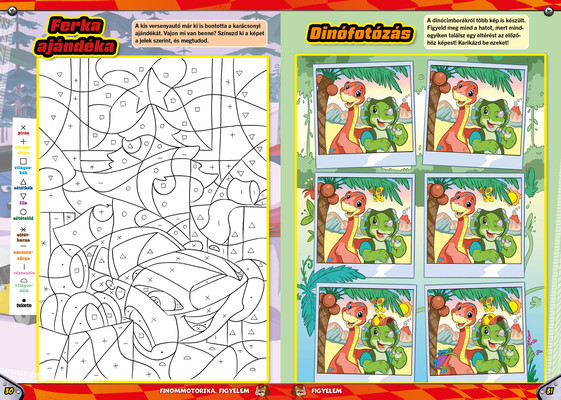 A színes oldalak minden hónapban tartalmaznak téri tájékozódást, alapvető matematikai készségeket, szín- és formaismeretet, logikus gondolkodást, koncentrációt és finommotorikát fejlesztő feladatokat, szórakoztató rejtvényeket és fejtörőket, rajzpályázatot, valamint hasznos nevelési tanácsokat a gyermekpszichológustól.