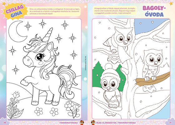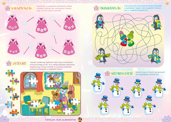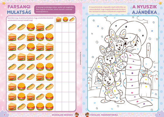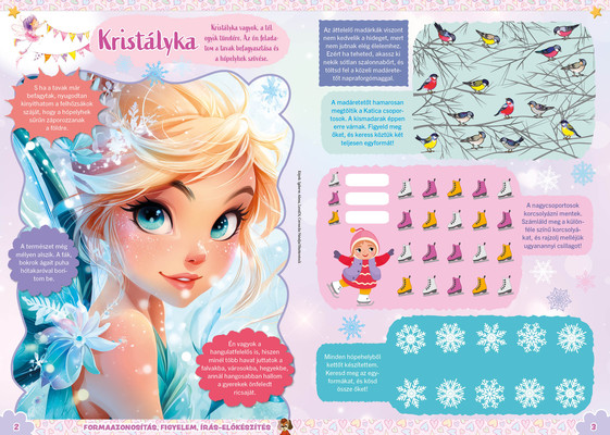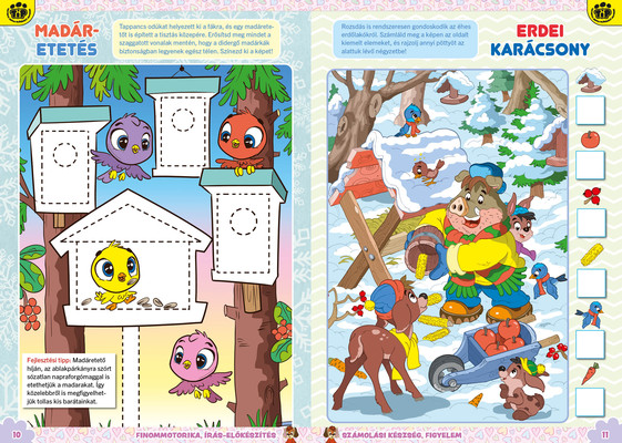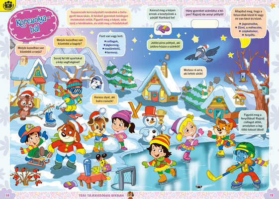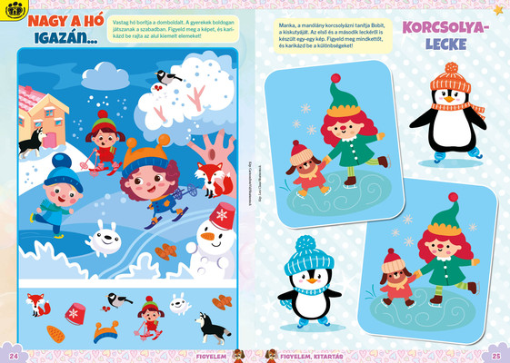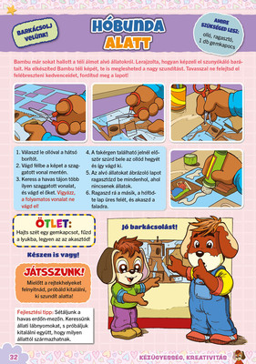 A színes oldalak minden hónapban tartalmaznak téri tájékozódást, alapvető matematikai készségeket, szín- és formaismeretet, logikus gondolkodást, koncentrációt és finommotorikát fejlesztő feladatokat, szórakoztató rejtvényeket és fejtörőket, rajzpályázatot, valamint hasznos nevelési tanácsokat a gyermekpszichológustól.