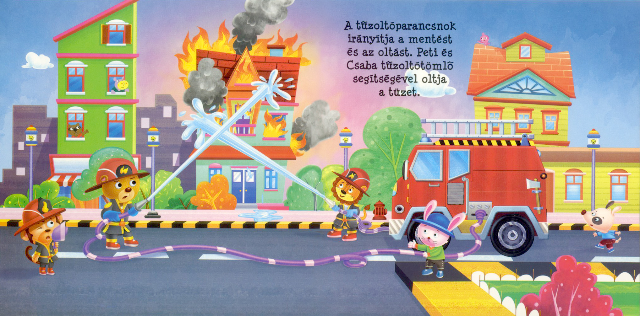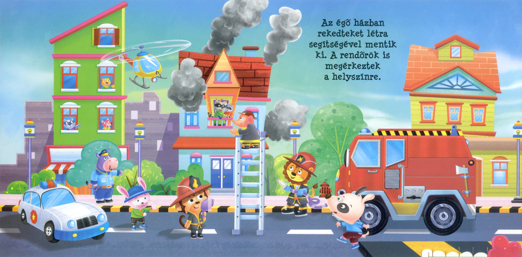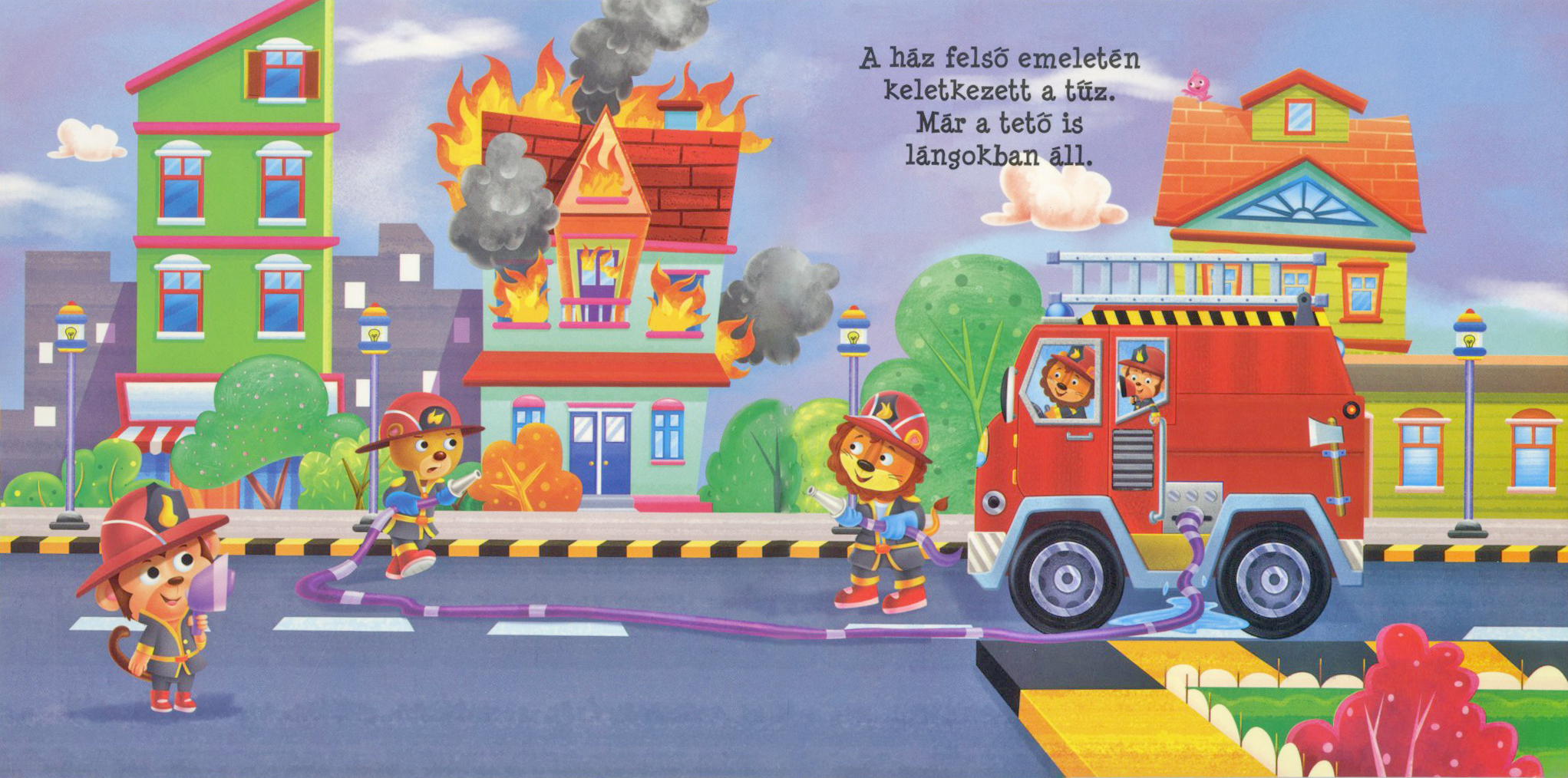 Leporelló kötetünkben egy kigyulladt házhoz sietnek a tűzoltók.