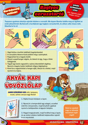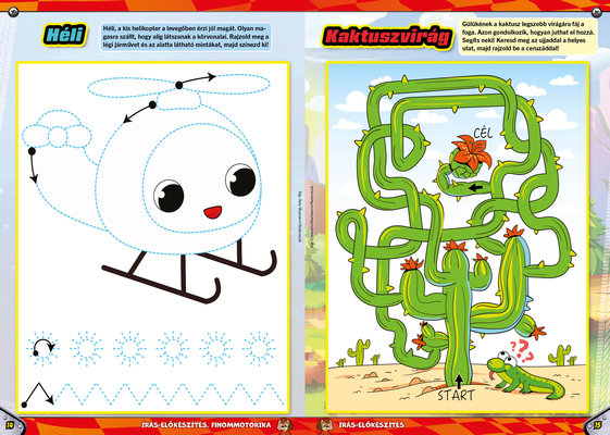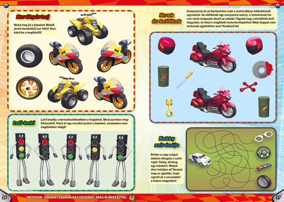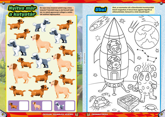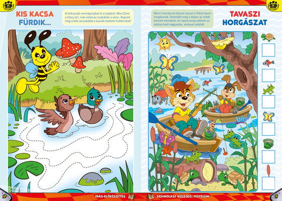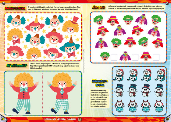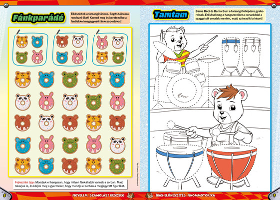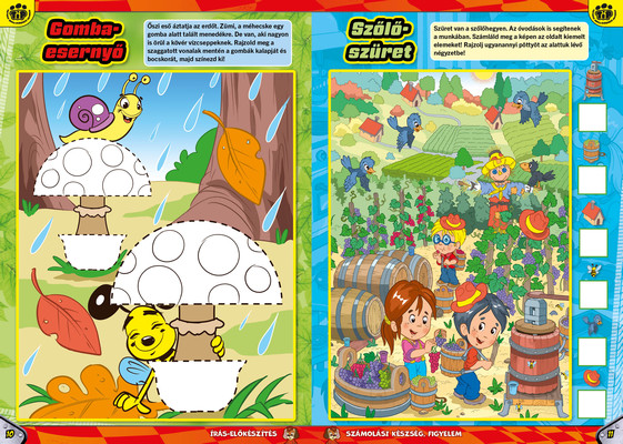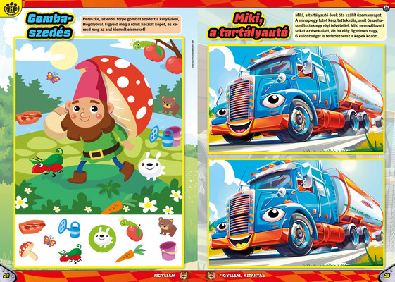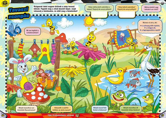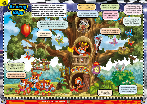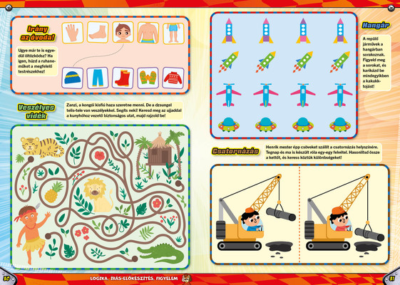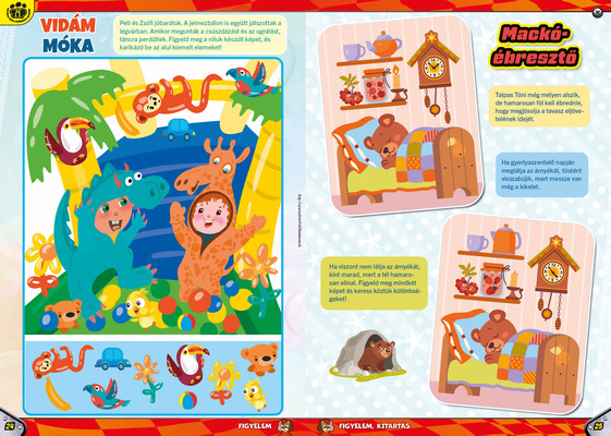 A színes oldalak minden hónapban tartalmaznak téri tájékozódást, alapvető matematikai készségeket, szín- és formaismeretet, logikus gondolkodást, koncentrációt és finommotorikát fejlesztő feladatokat, szórakoztató rejtvényeket és fejtörőket, rajzpályázatot, valamint hasznos nevelési tanácsokat a gyermekpszichológustól.