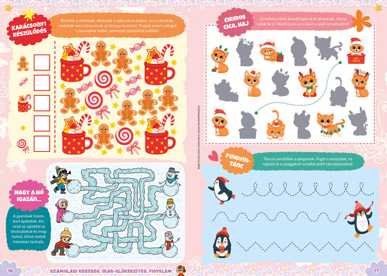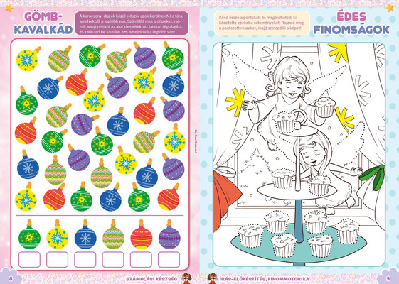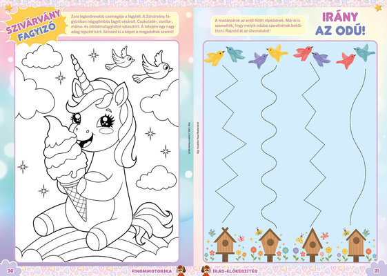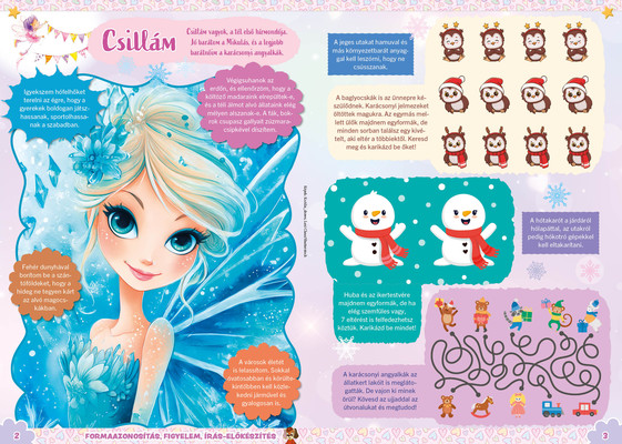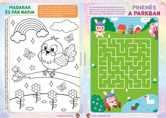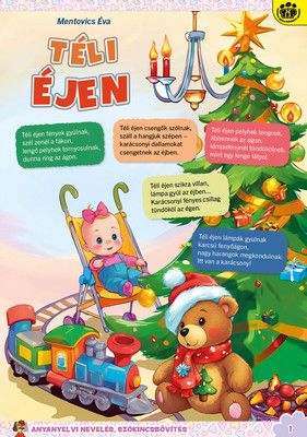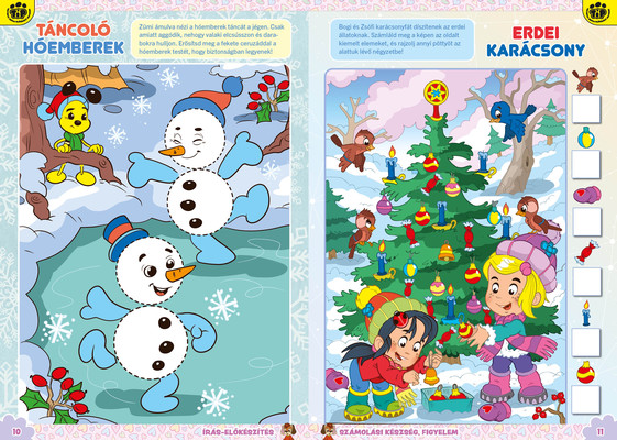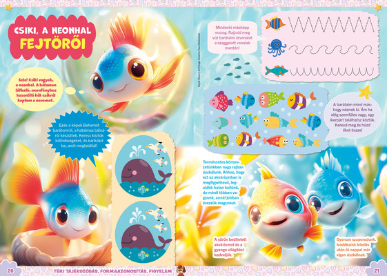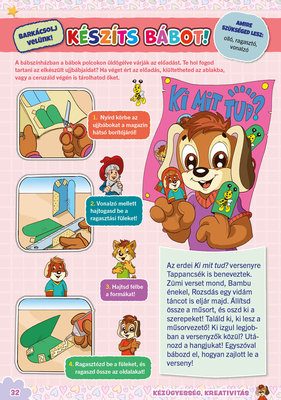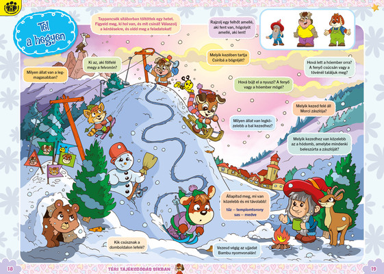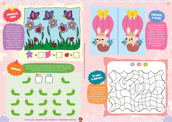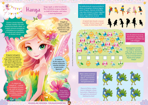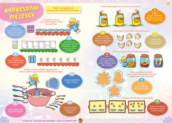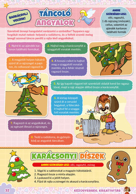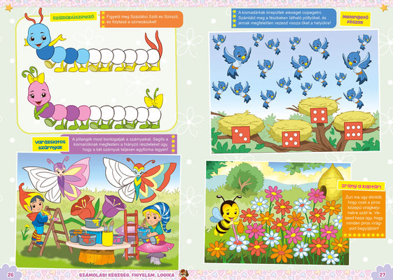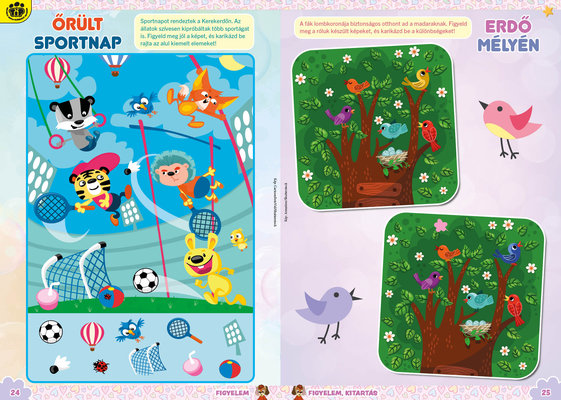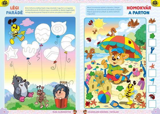 A színes oldalak minden hónapban tartalmaznak téri tájékozódást, alapvető matematikai készségeket, szín- és formaismeretet, logikus gondolkodást, koncentrációt és finommotorikát fejlesztő feladatokat, szórakoztató rejtvényeket és fejtörőket, rajzpályázatot, valamint hasznos nevelési tanácsokat a gyermekpszichológustól.