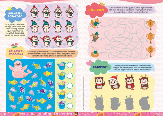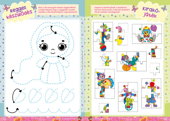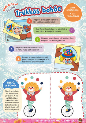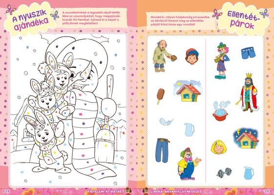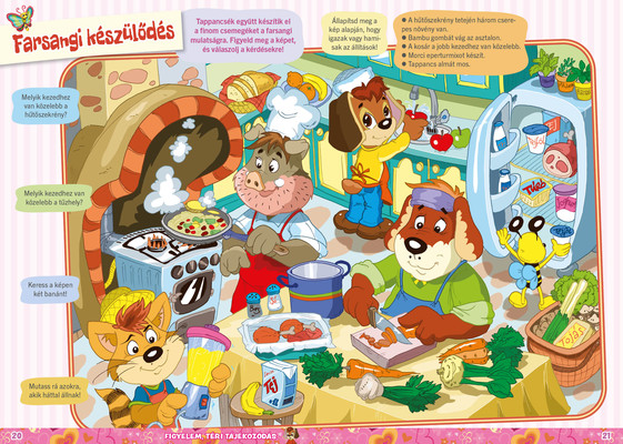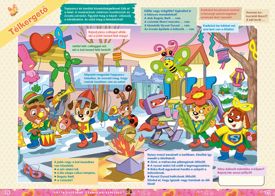 A színes oldalak minden hónapban tartalmaznak téri tájékozódást, alapvető matematikai készségeket, szín- és formaismeretet, logikus gondolkodást, koncentrációt és finommotorikát fejlesztő feladatokat, szórakoztató rejtvényeket és fejtörőket, rajzpályázatot, valamint hasznos nevelési tanácsokat a gyermekpszichológustól.